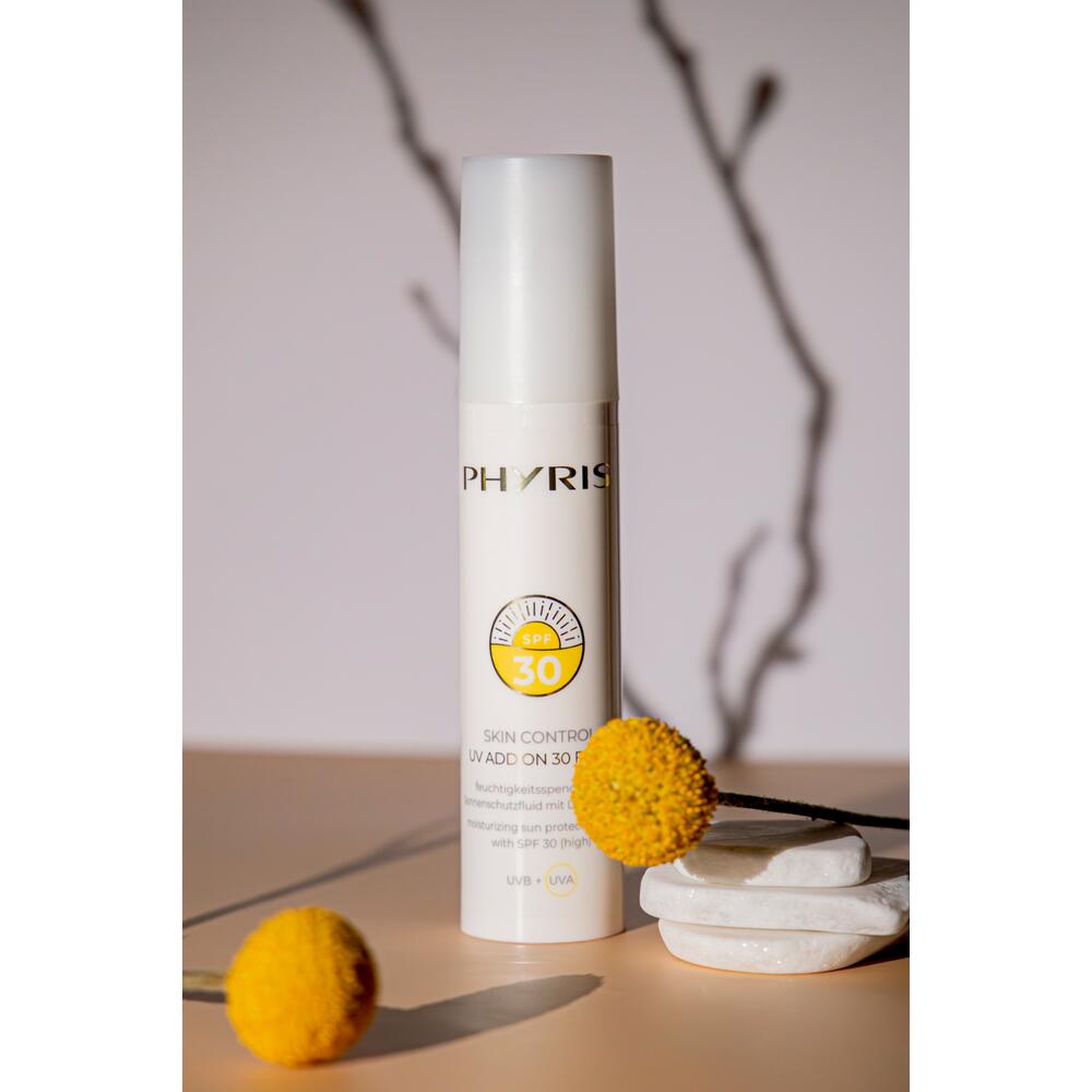 De PHYRIS UV Add On 30 Fluid beschermt de huid tegen UVA- en UVB-straling met zonbeschermingsfactor 30 (hoog). De zeer lichte, niet-vette textuur trekt snel in en laat een verzorgd huidgevoel achter.